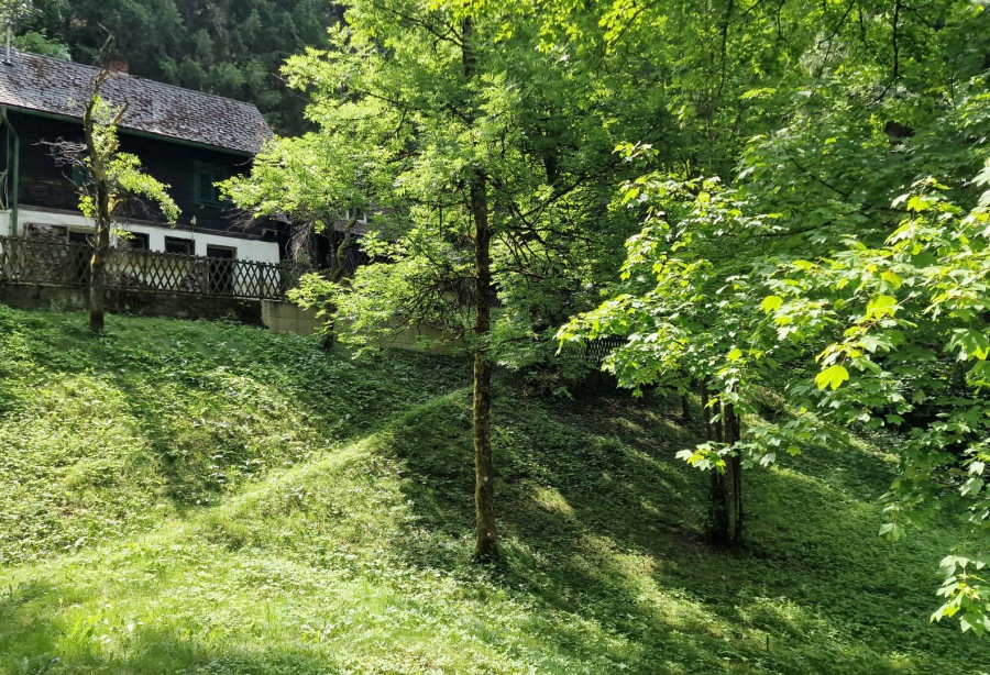 Der Garten bietet ausreichend Platz für gärtnerische Aktivitäten und bietet durch die Hanglage einen schönen Ausblick in die umgebende Natur.