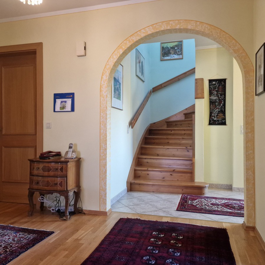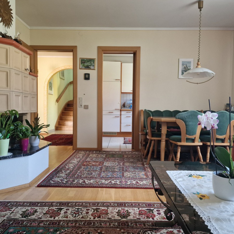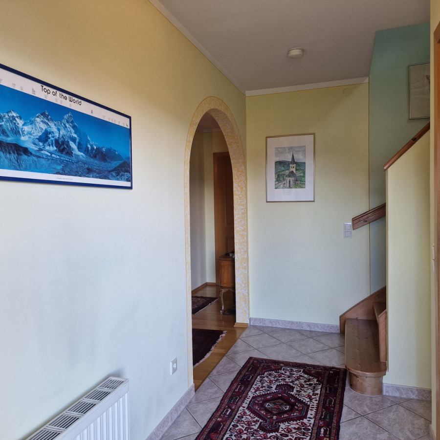 Im Inneren punkten vor allem das Wohnzimmer mit Kachelofen mit abgetrennter Küche. 2 Schlafzimmer, Bad, WC und ein großer Vorraum mit hellem Eingangsbereich befinden sich weiters im Erdgeschoß.